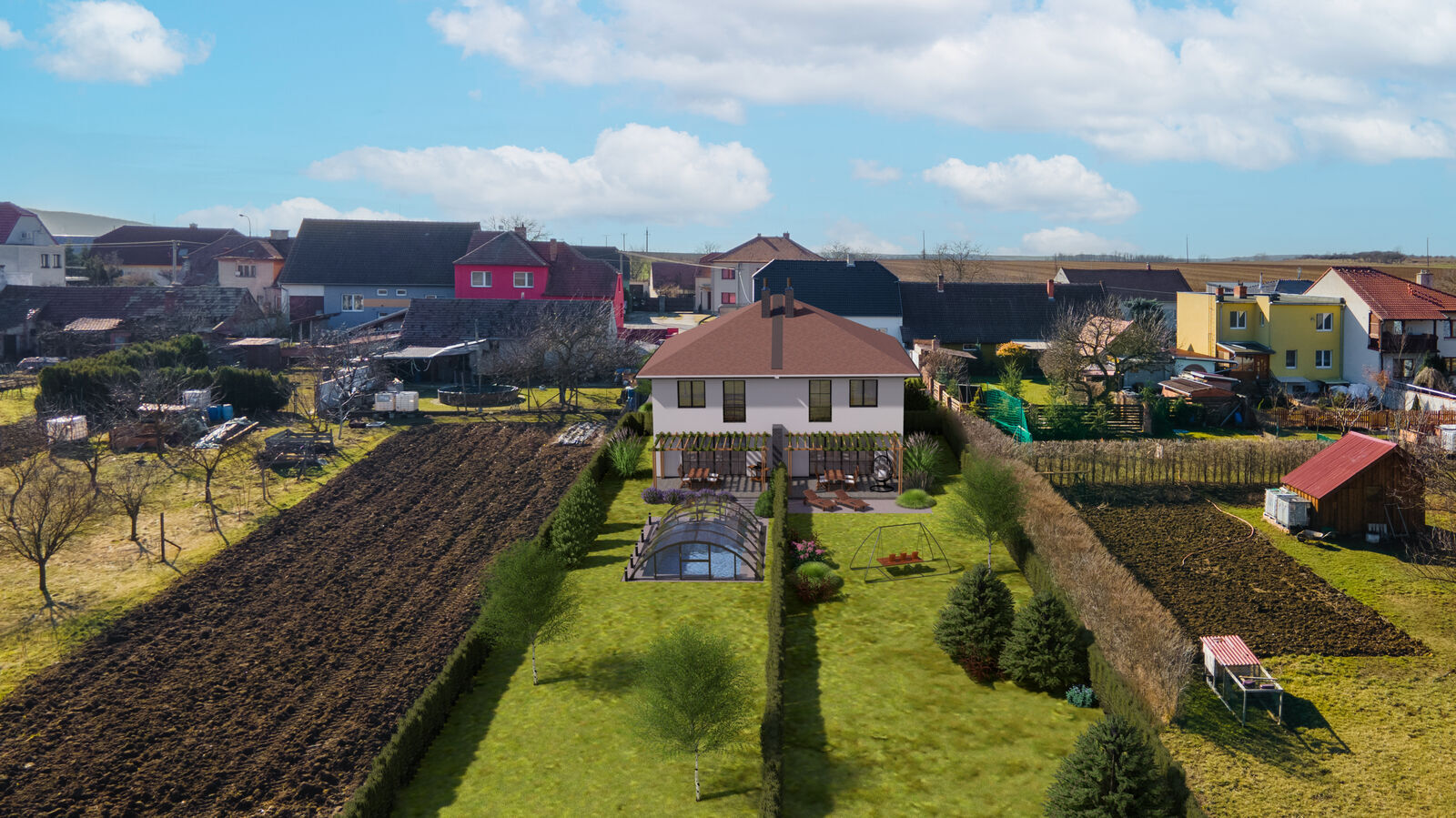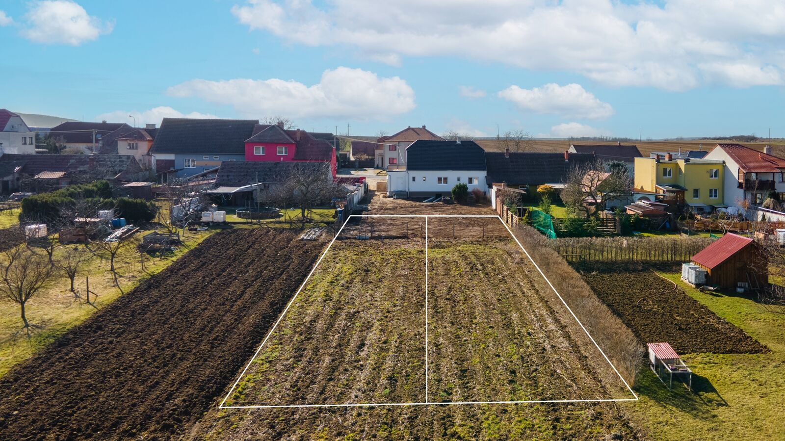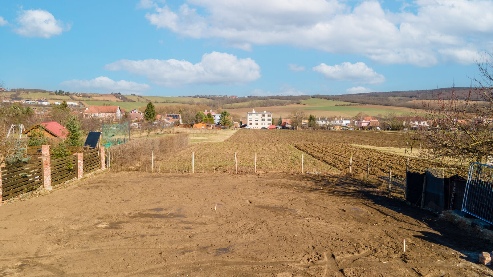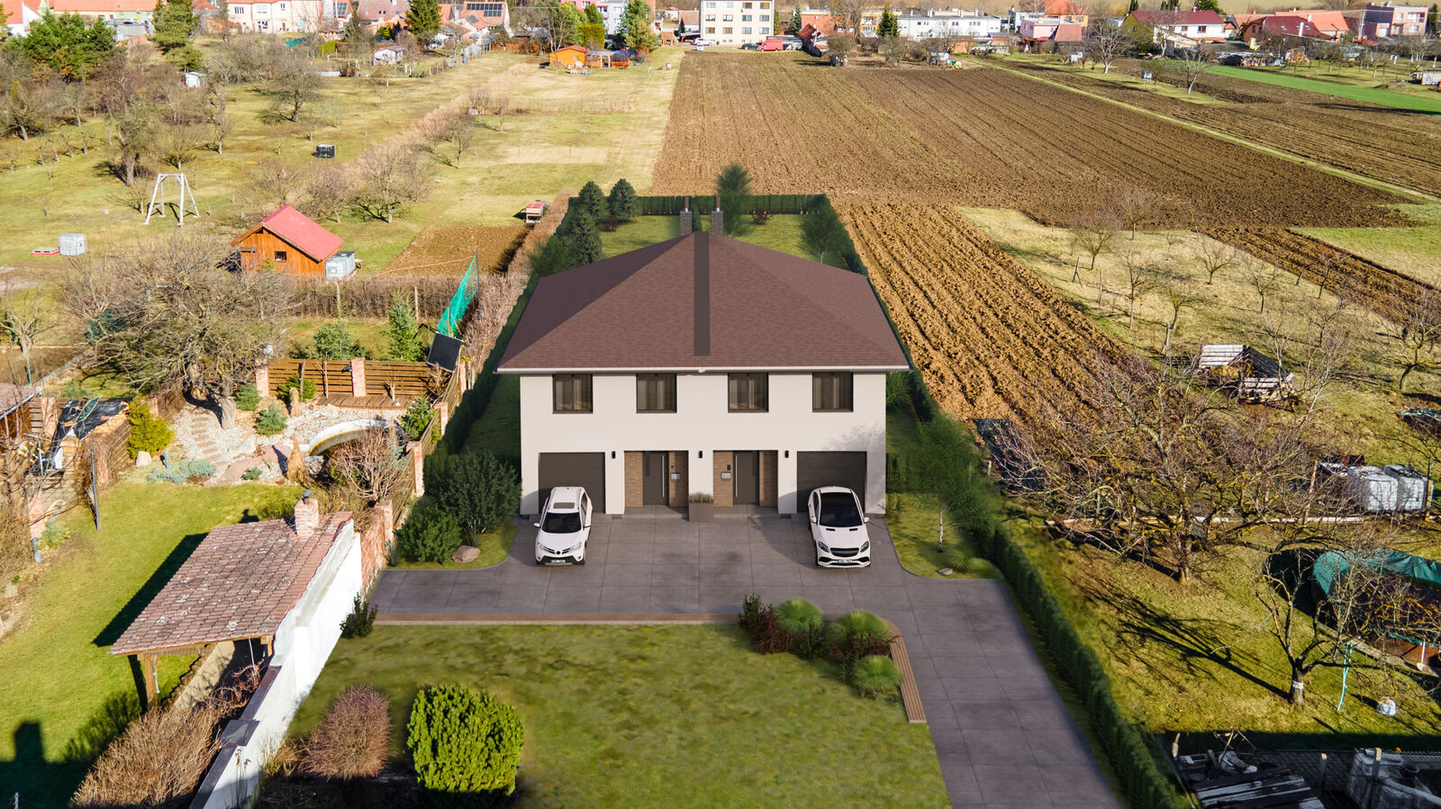 Součástí této nabídky je také projekt na stavbu dvoupatrového dvojdomu, každý 5+1 s užitnou podlahovou plochou 129 m², ideální zahradou, venkovním parkovacím stáním i garáží. K pozemkům náleží i společná příjezdová cesta.