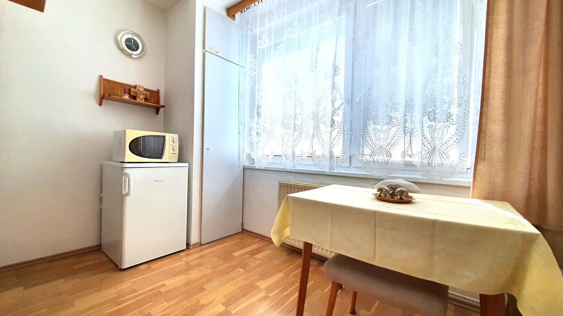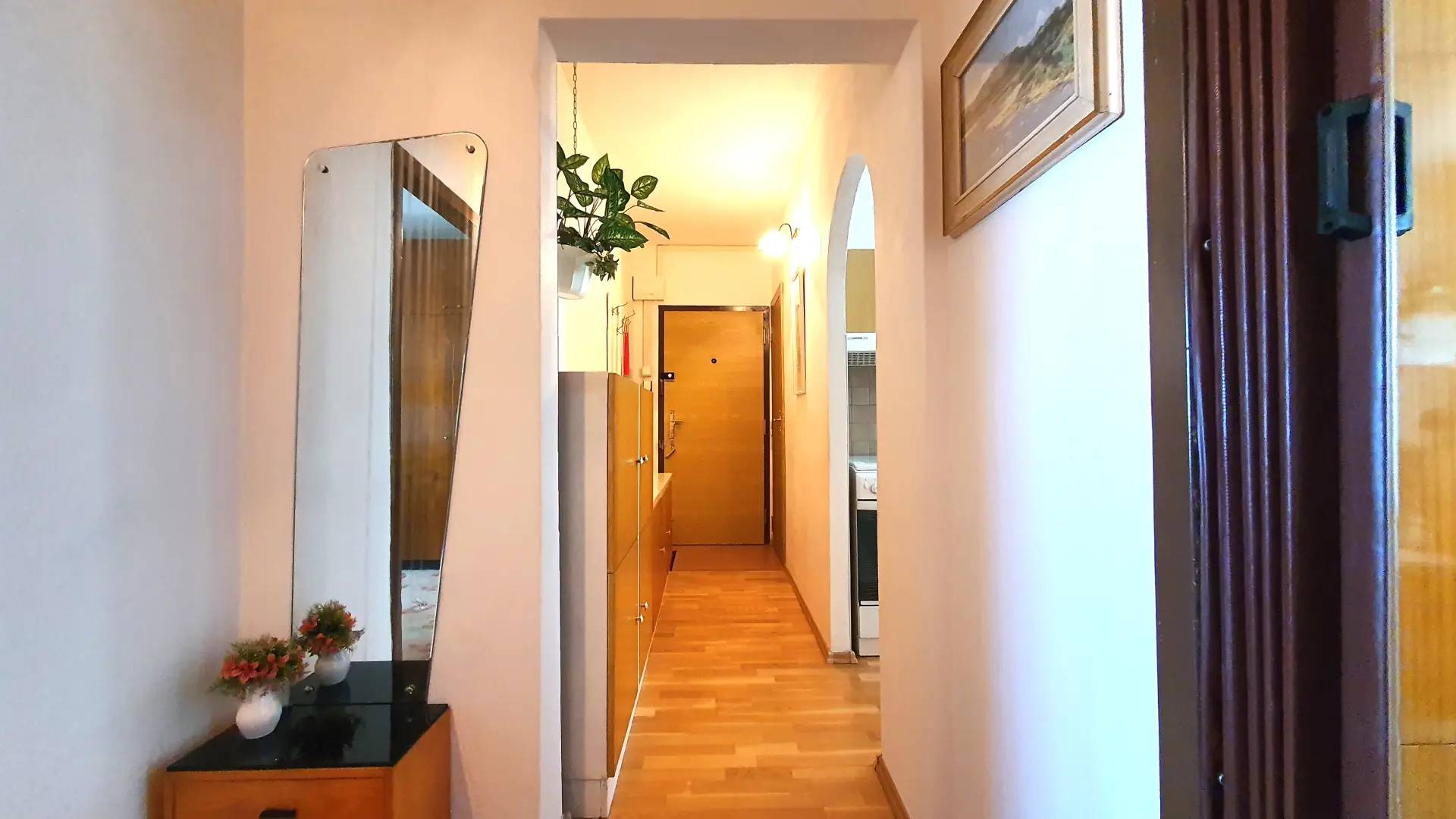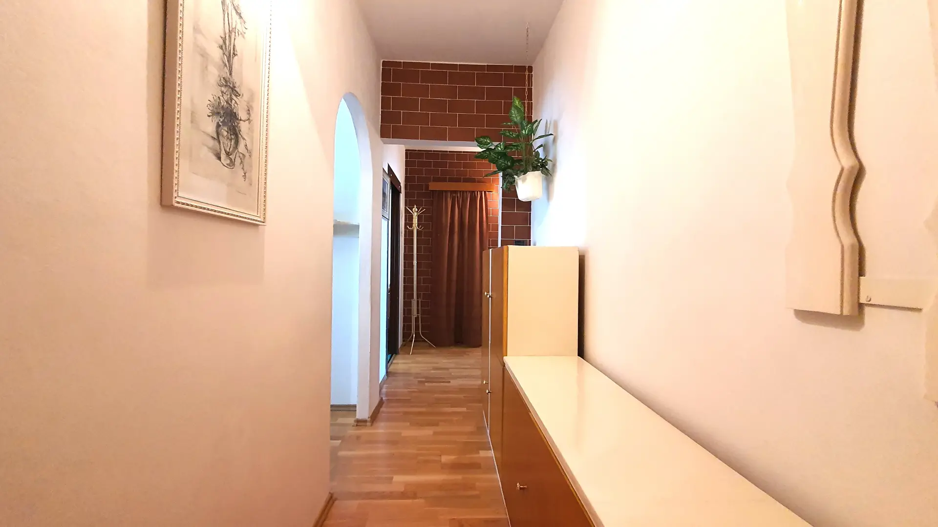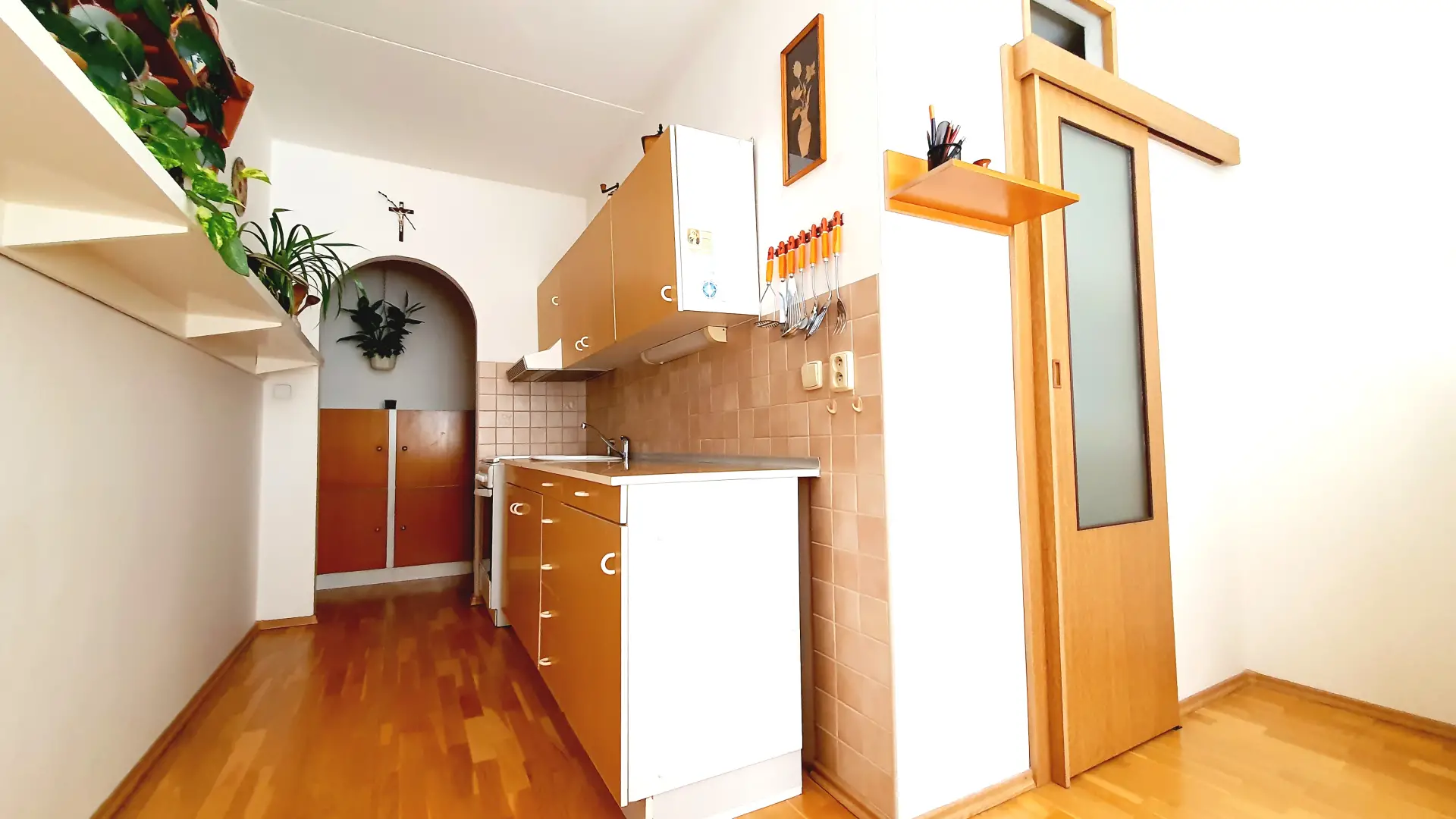 V předsíni a kuchyni jsou položeny dřevěné podlahy.