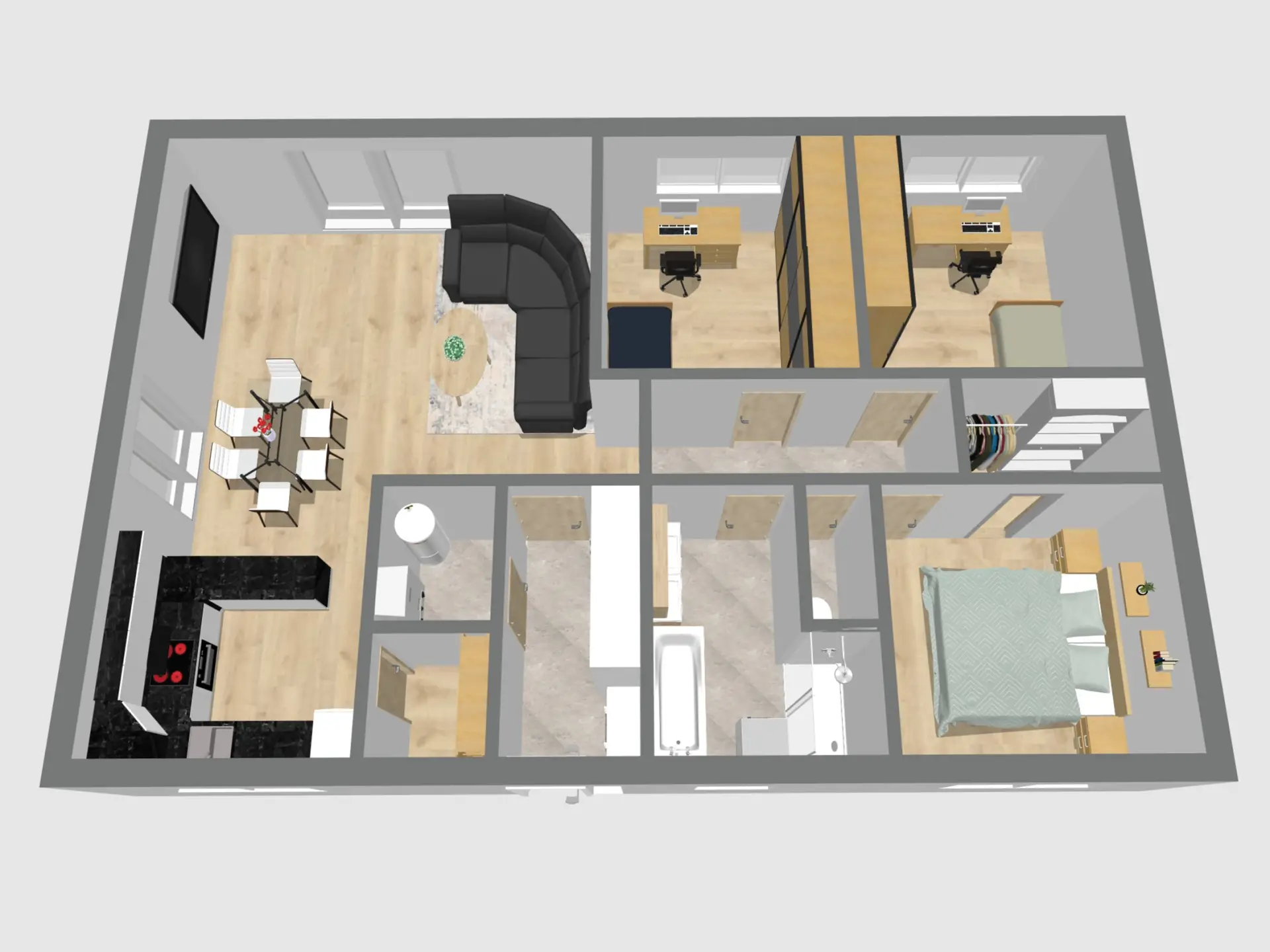spíž – 2,25 m², vinyl, chodba – 5,9 m², vinyl, ložnice – 12,95 m², vinyl, dva dětské pokoje po