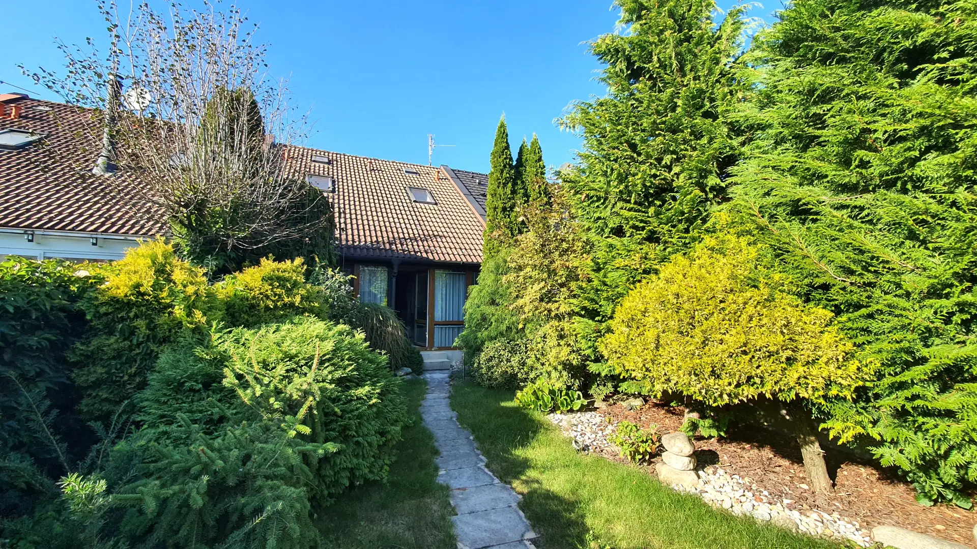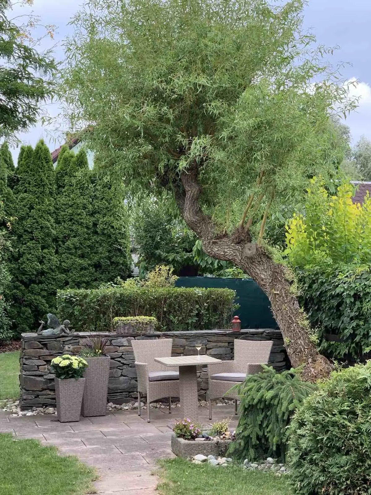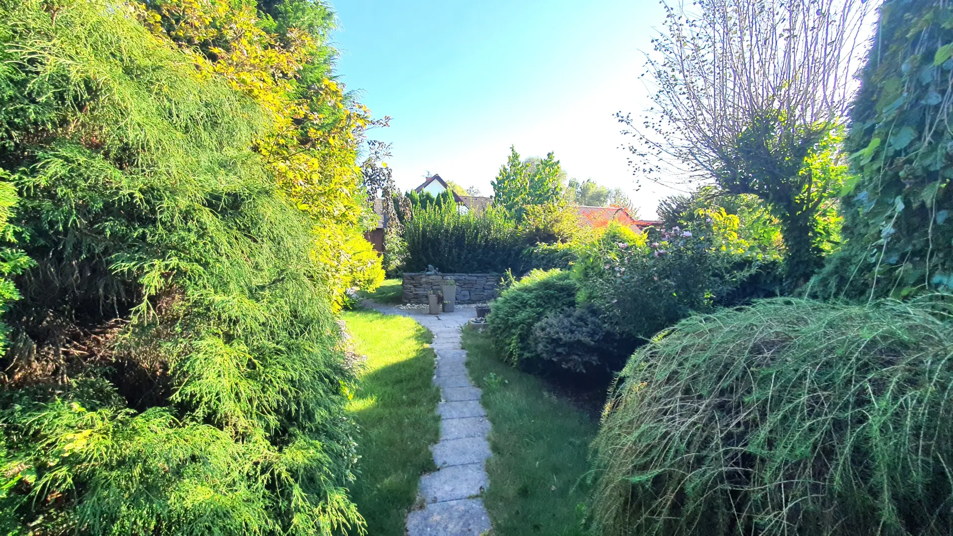 Zahrada je osázena okrasnými stromy a keři a poskytuje příjemné posezení nejen v horkých letních dnech.