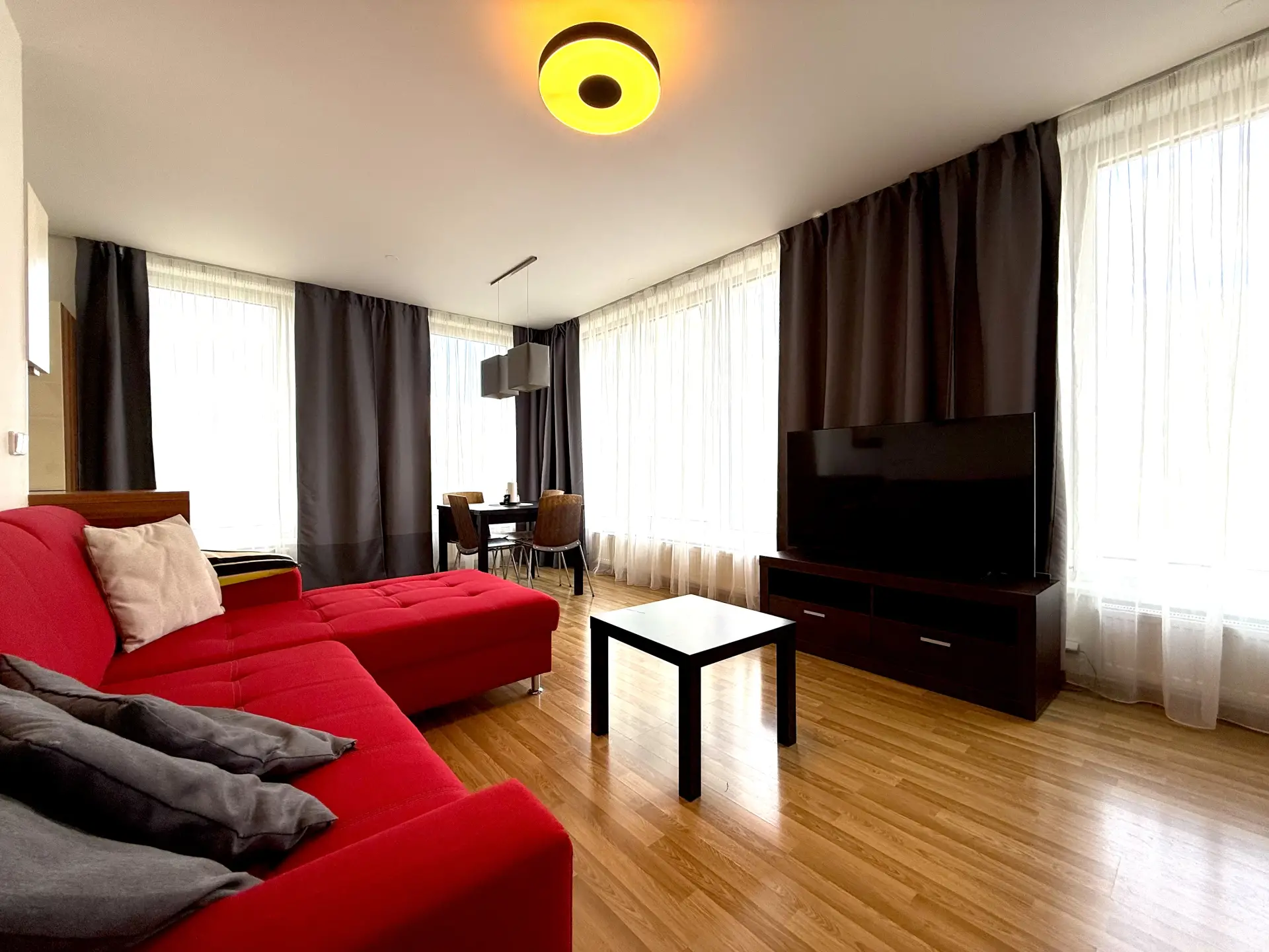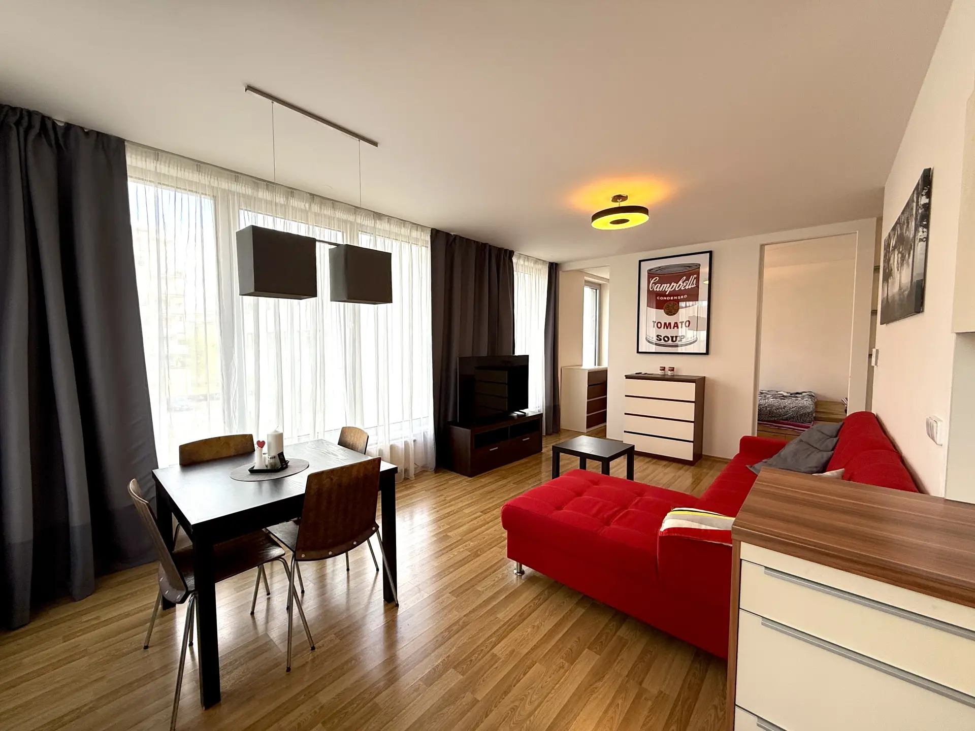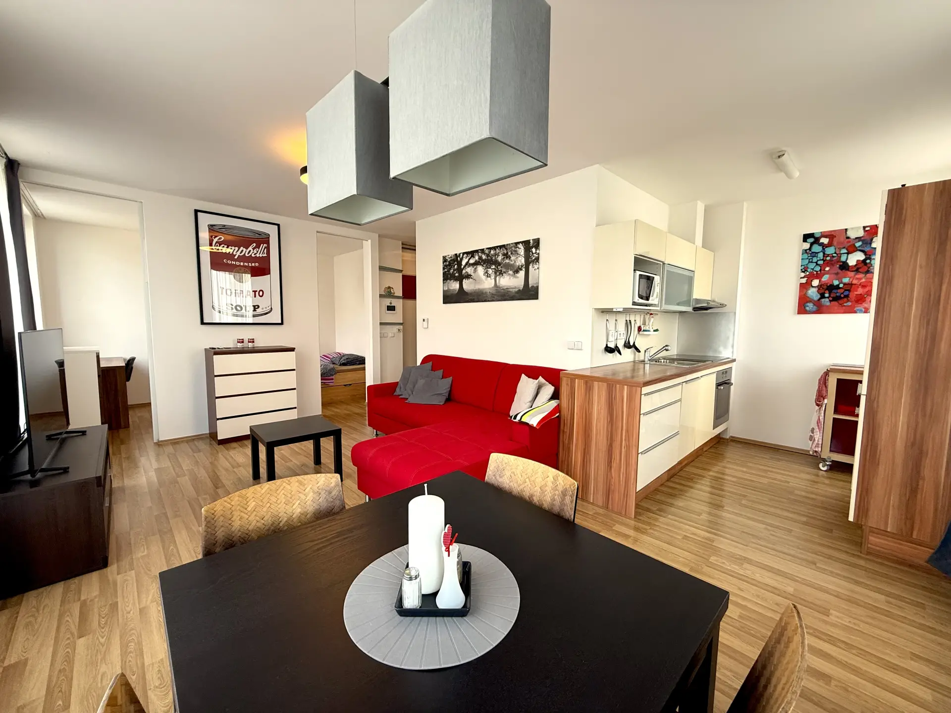 Byt je kompletně vybaven (kuchyňská linka včetně spotřebičů, pračka, vestavné skříně, postel, sedačka, jídelní stůl, televizní stolek, komody apod.) - součástí prodeje nejsou pouze obrazy a TV.