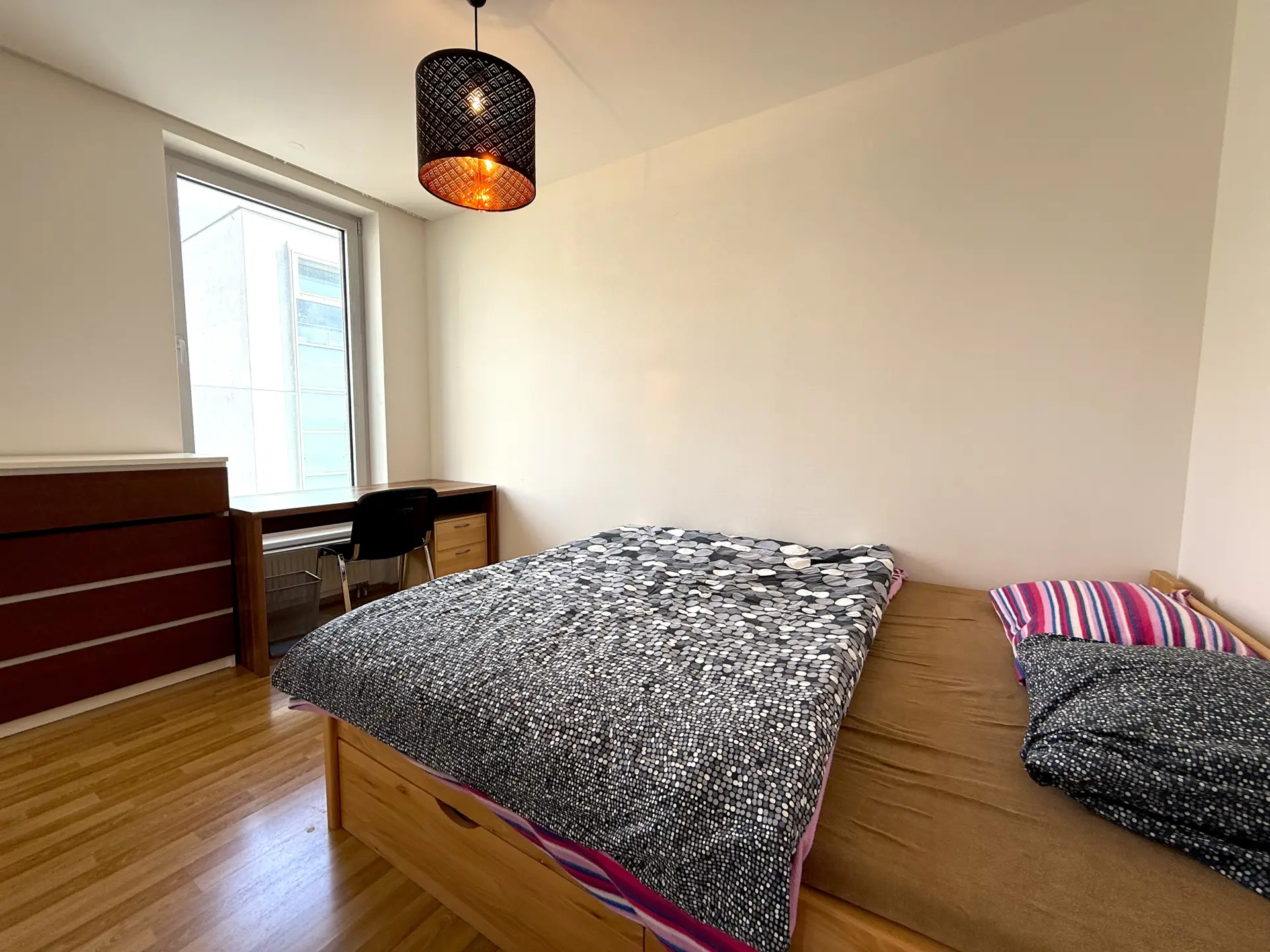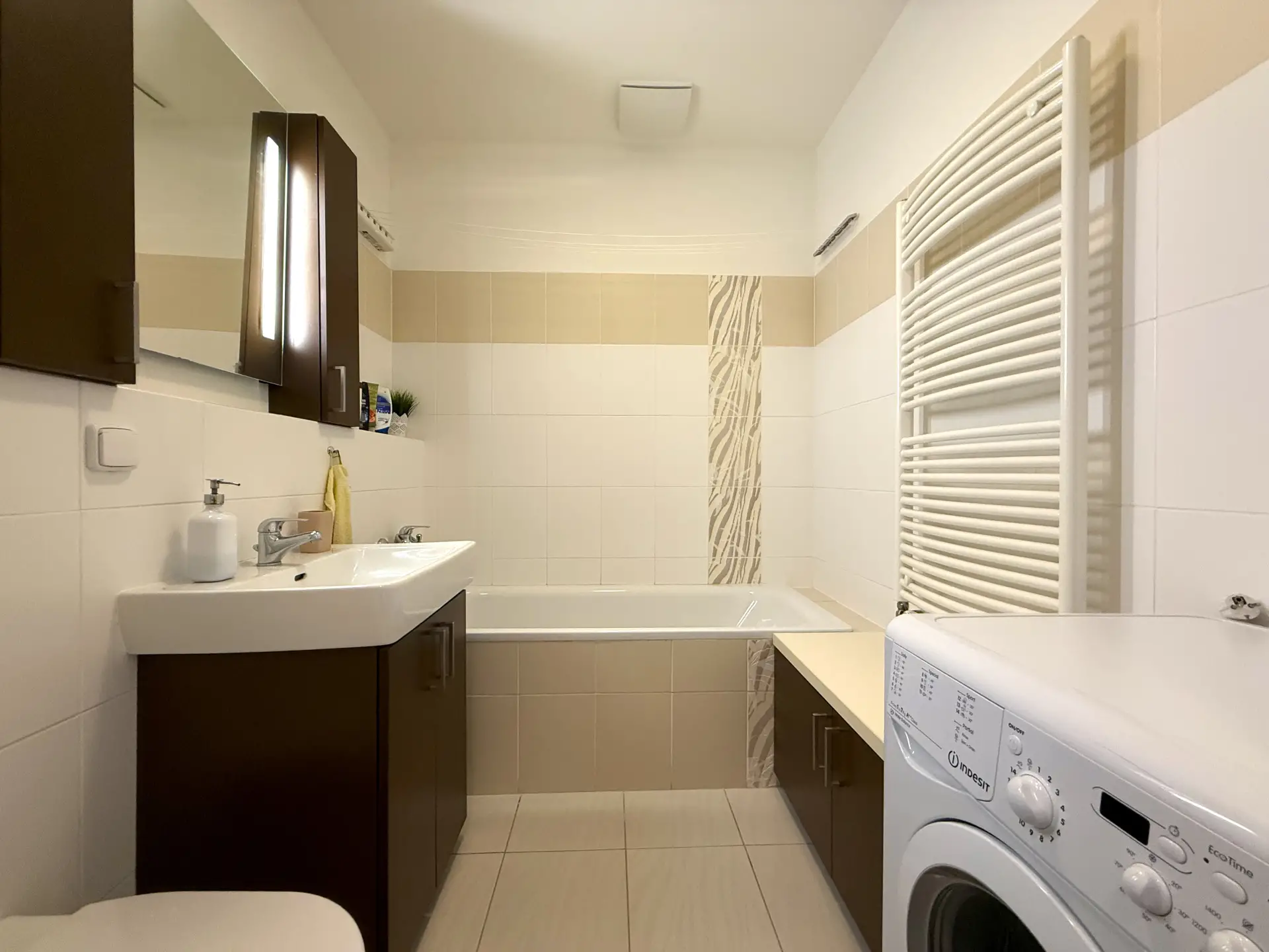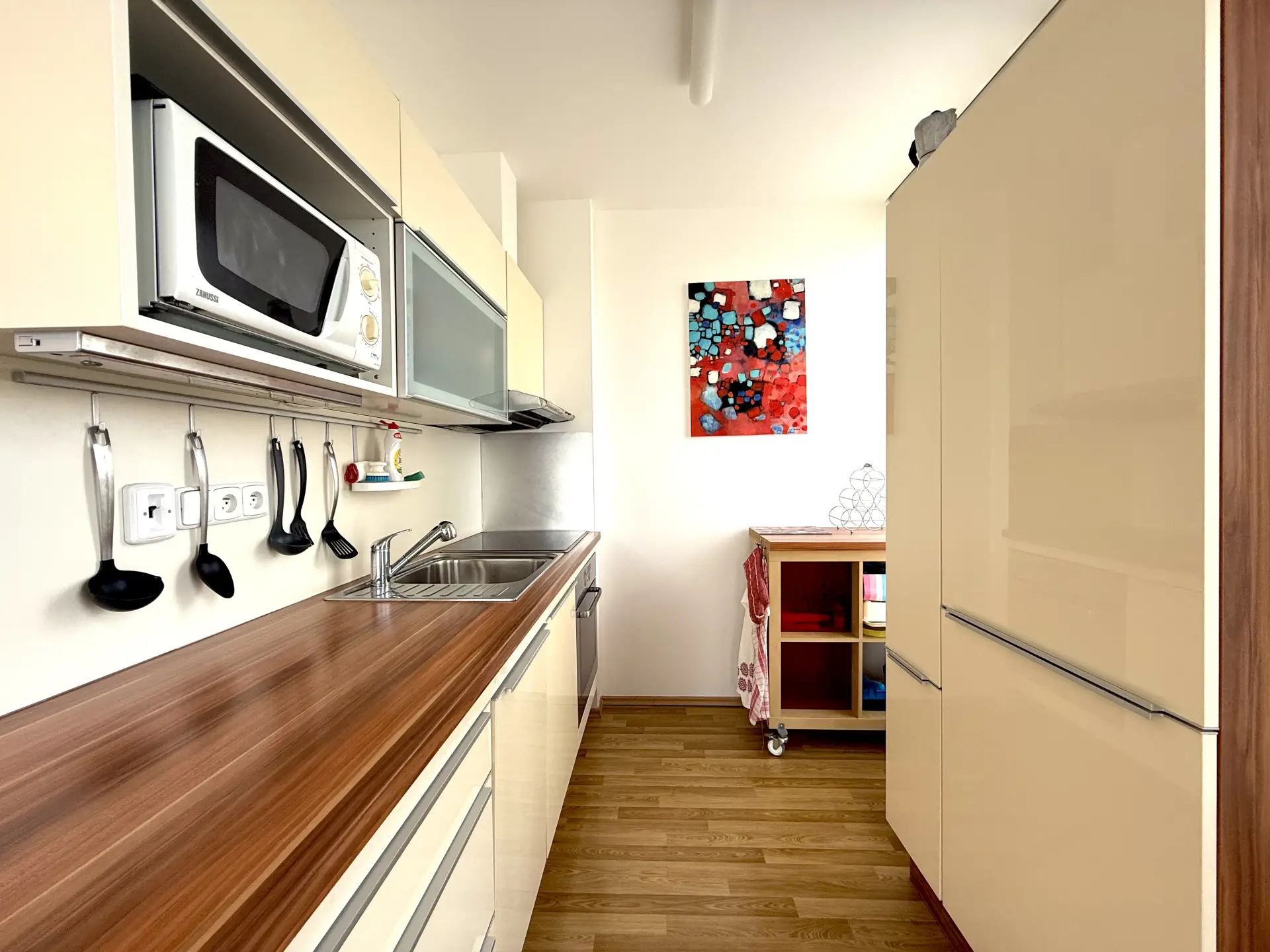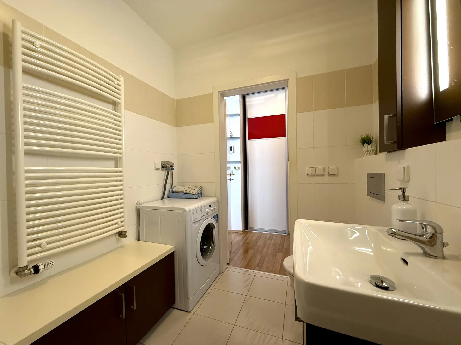 Byt je kompletně vybaven (kuchyňská linka včetně spotřebičů, pračka, vestavné skříně, postel, sedačka, jídelní stůl, televizní stolek, komody apod.) - součástí prodeje nejsou pouze obrazy a TV.