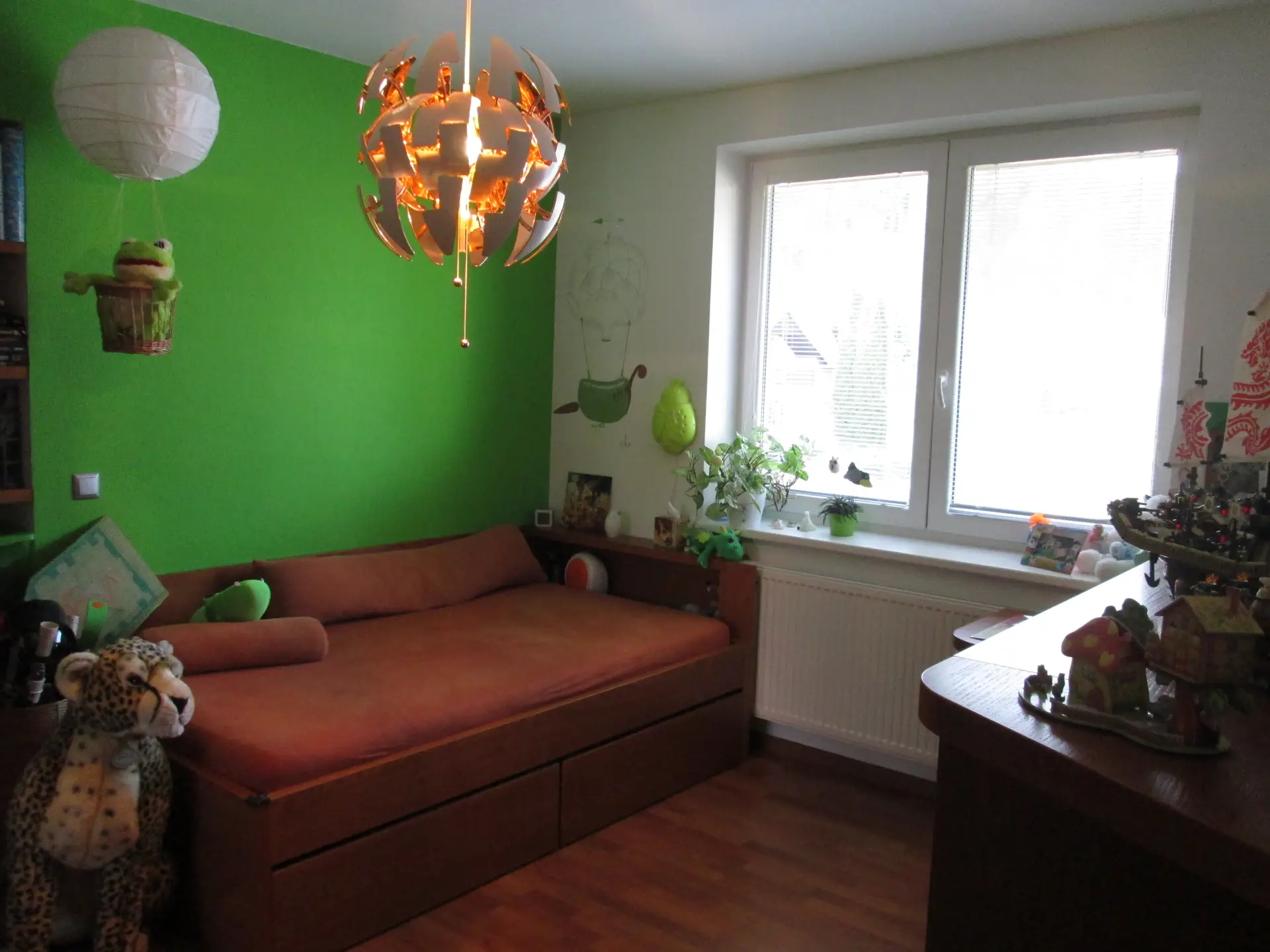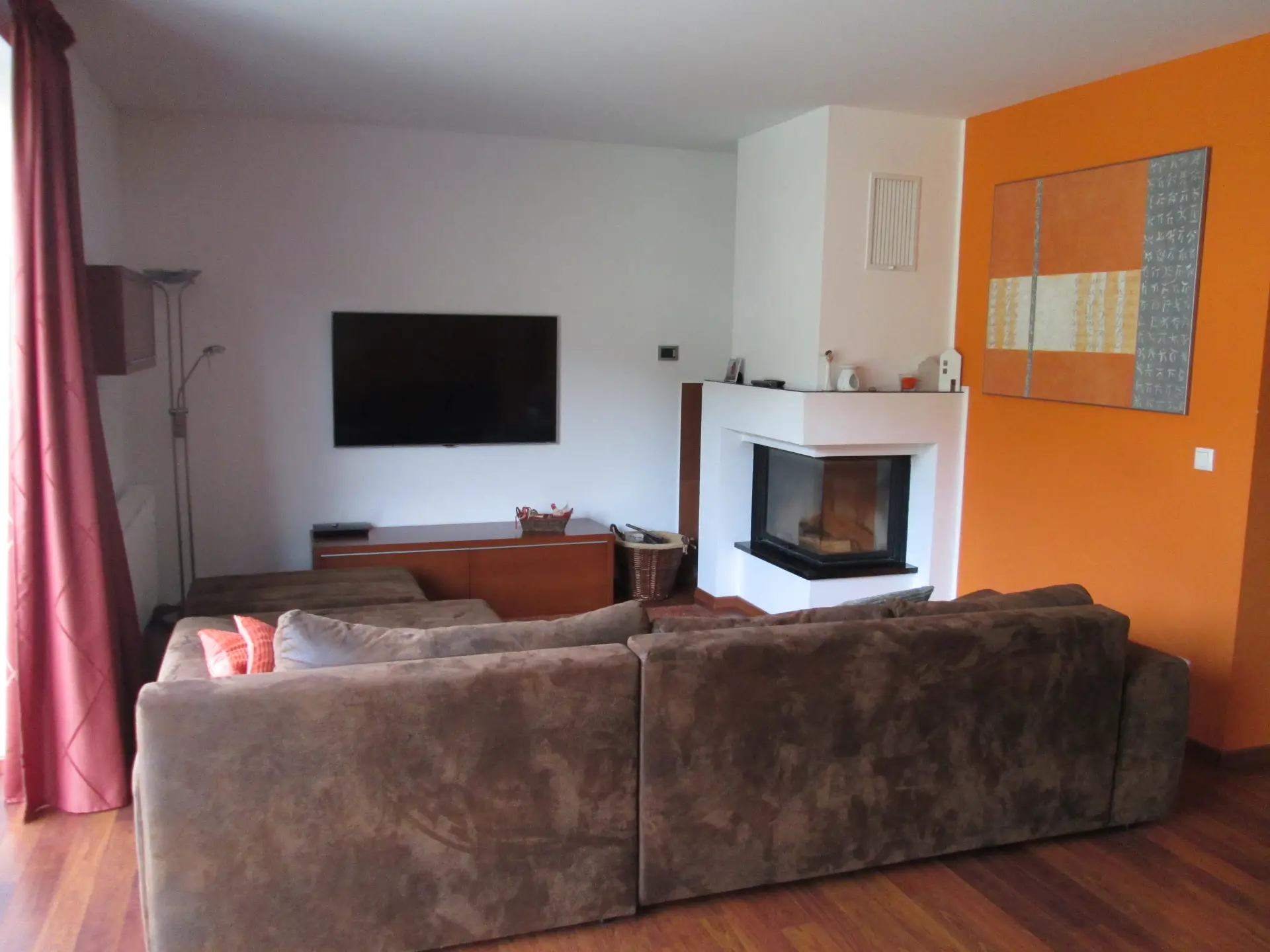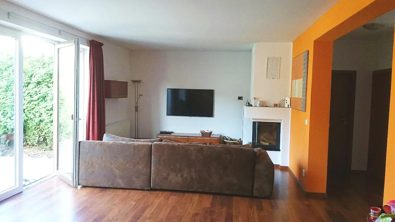 * **Srdce domu:** Prostorný obývací pokoj s přímým vstupem na terasu a zahradu. Dominantou je moderní **rohový krb** a výrazná designová výmalba, která dodává prostoru energii.
