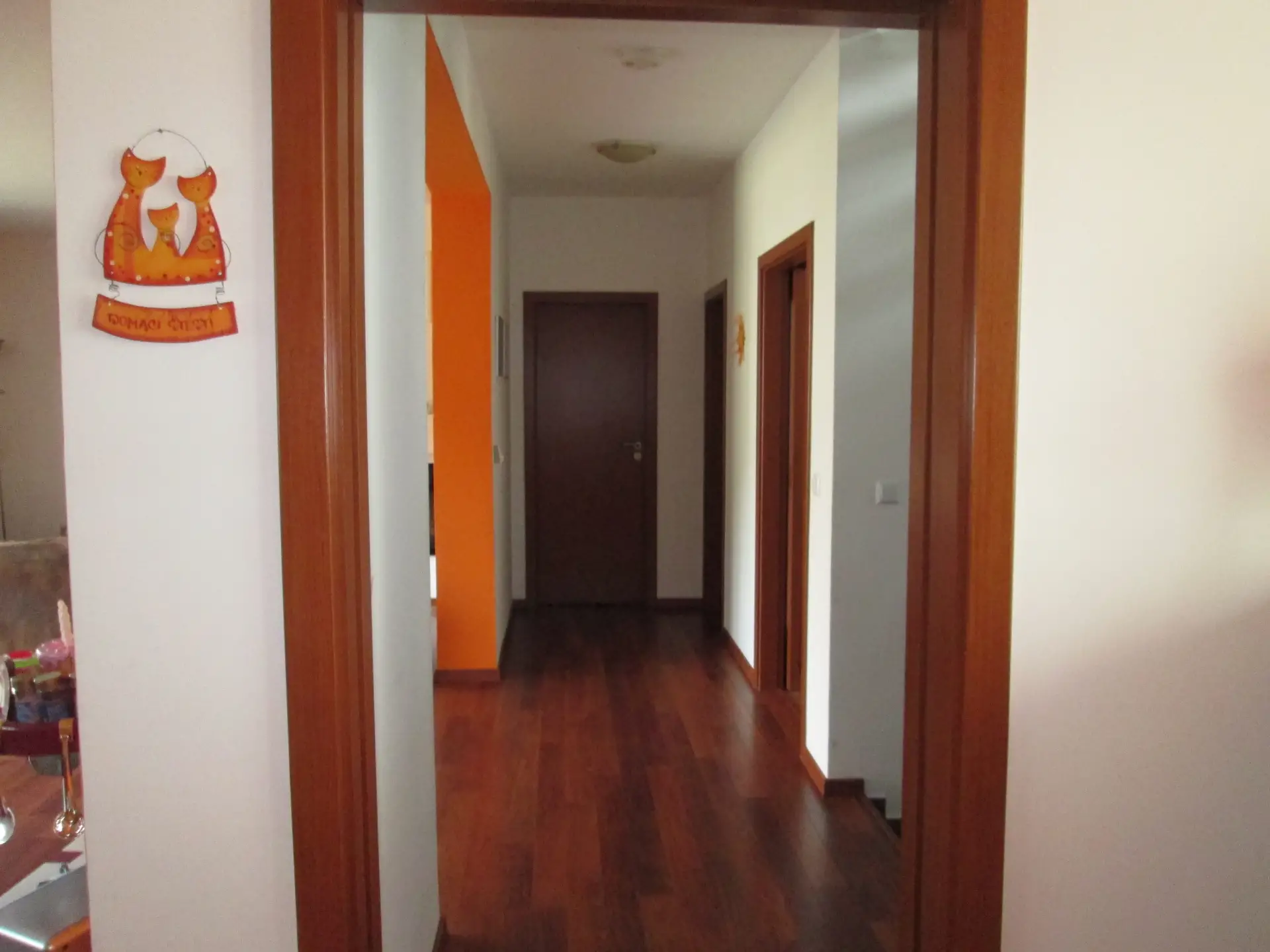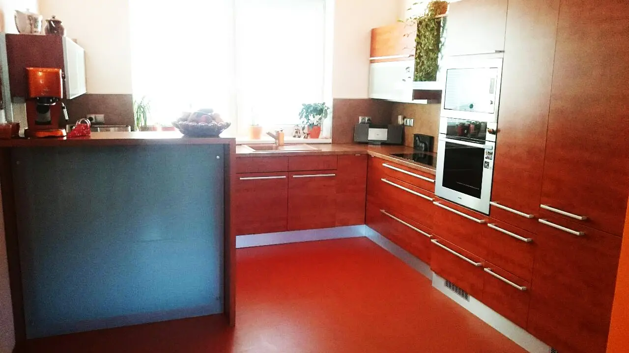 * **Kuchyně a jídelna:** Plně vybavená kuchyňská linka v dekoru dřeva s vestavnými spotřebiči (trouba, mikrovlnná trouba ve výšce očí) a praktickým ostrůvkem. Navazující jídelní kout pohodlně pojme velký rodinný stůl.