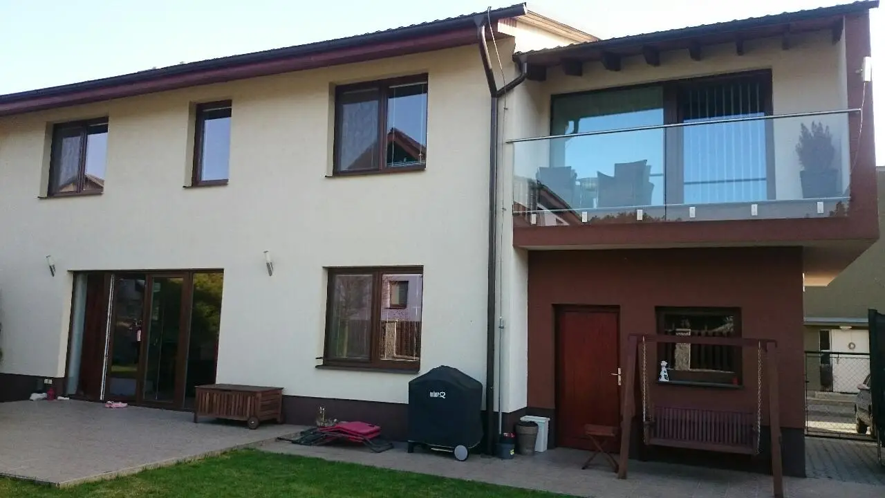 * **Ložnice:** Světlé pokoje v patře, z nichž jeden disponuje prostorným balkonem s moderním skleněným zábradlím.