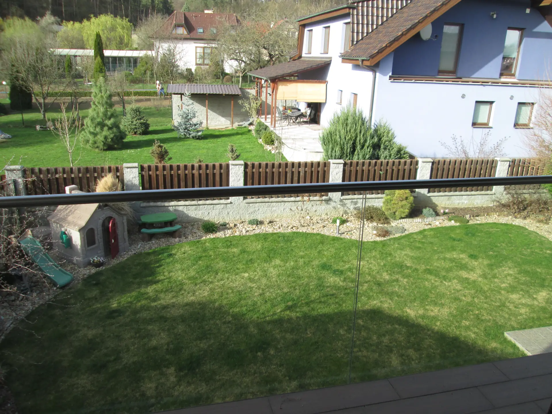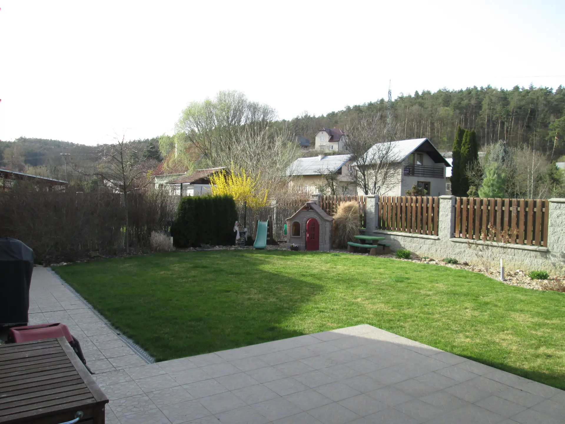 * **Zahrada:** Oplocená, rovinatá zahrada s trávníkem, ideální pro relaxaci nebo dětské hry (včetně dětského domečku).