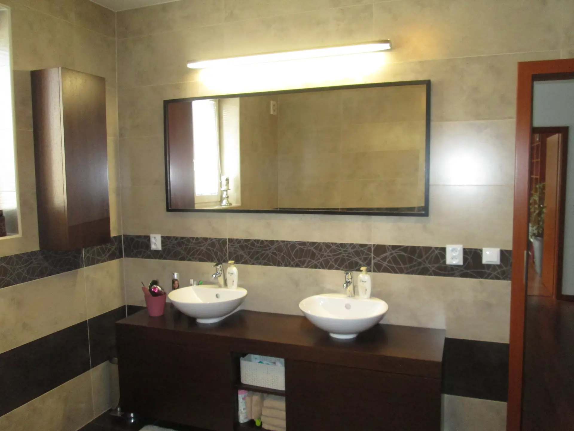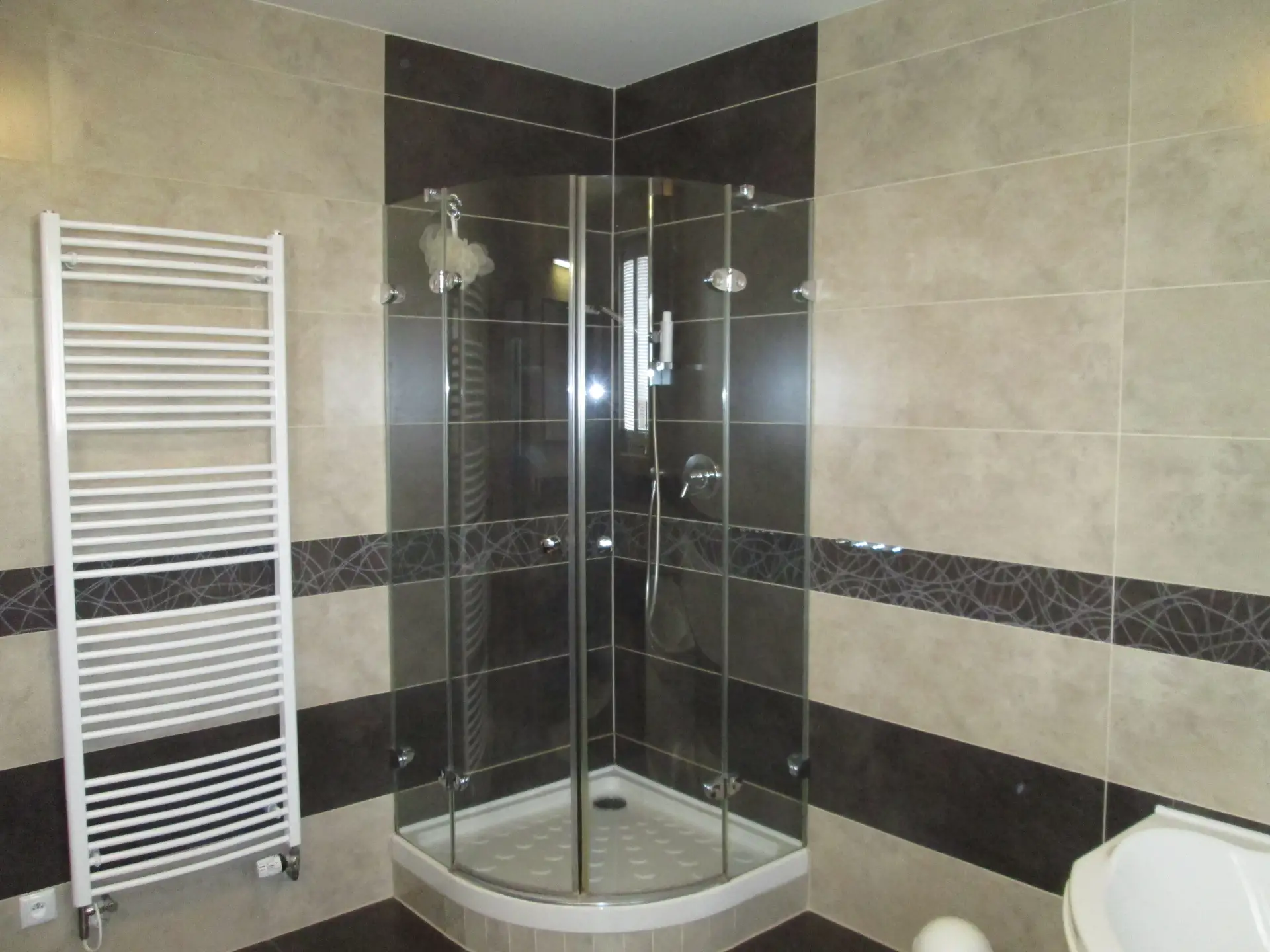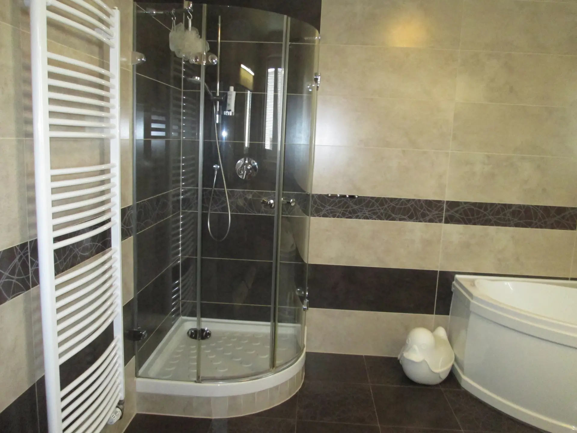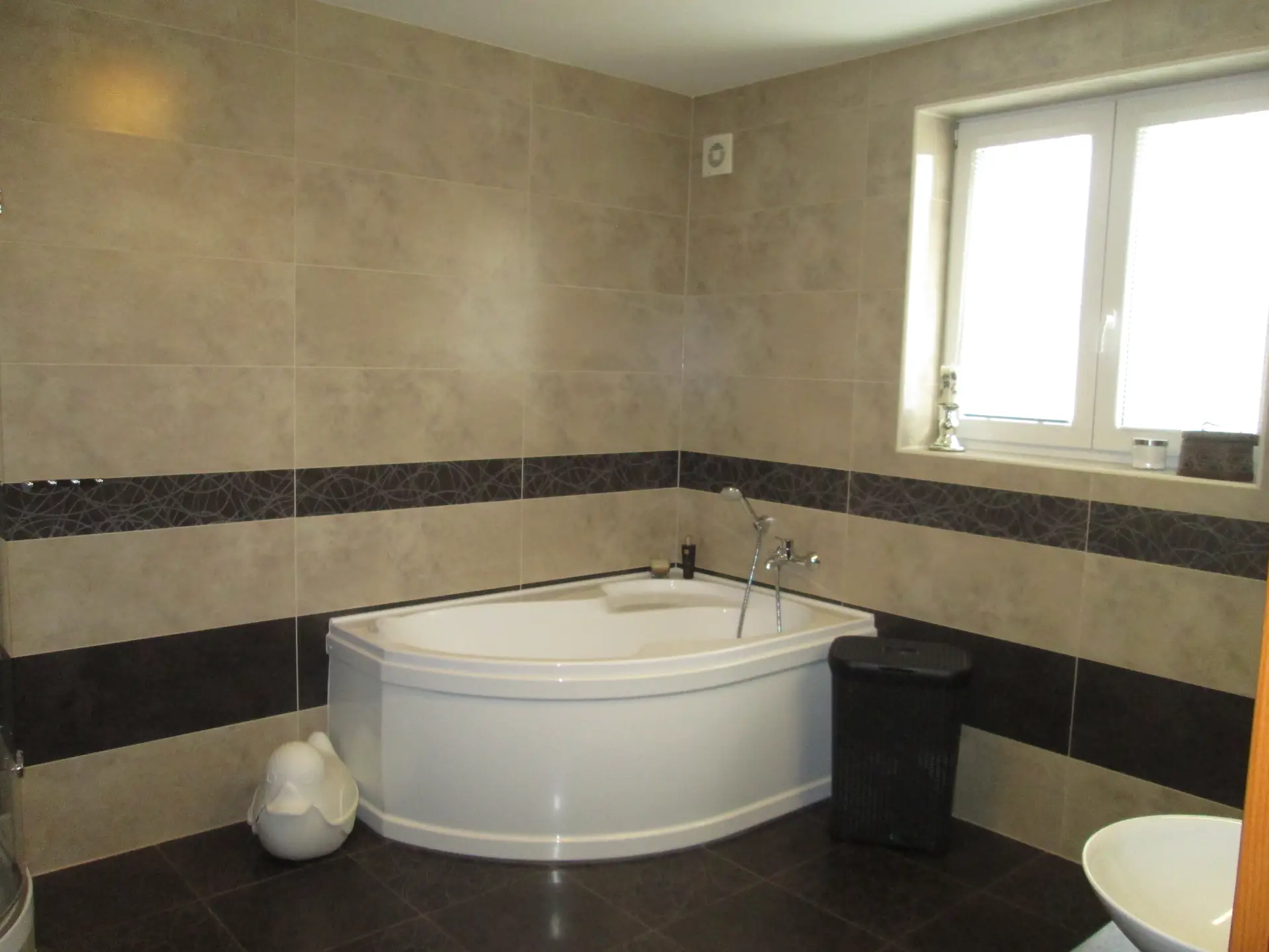 * **Koupelna:** Nadstandardně řešená koupelna s velkou rohovou vanou, čtvrtkruhovým sprchovým koutem a designovými obklady v přírodních tónech.