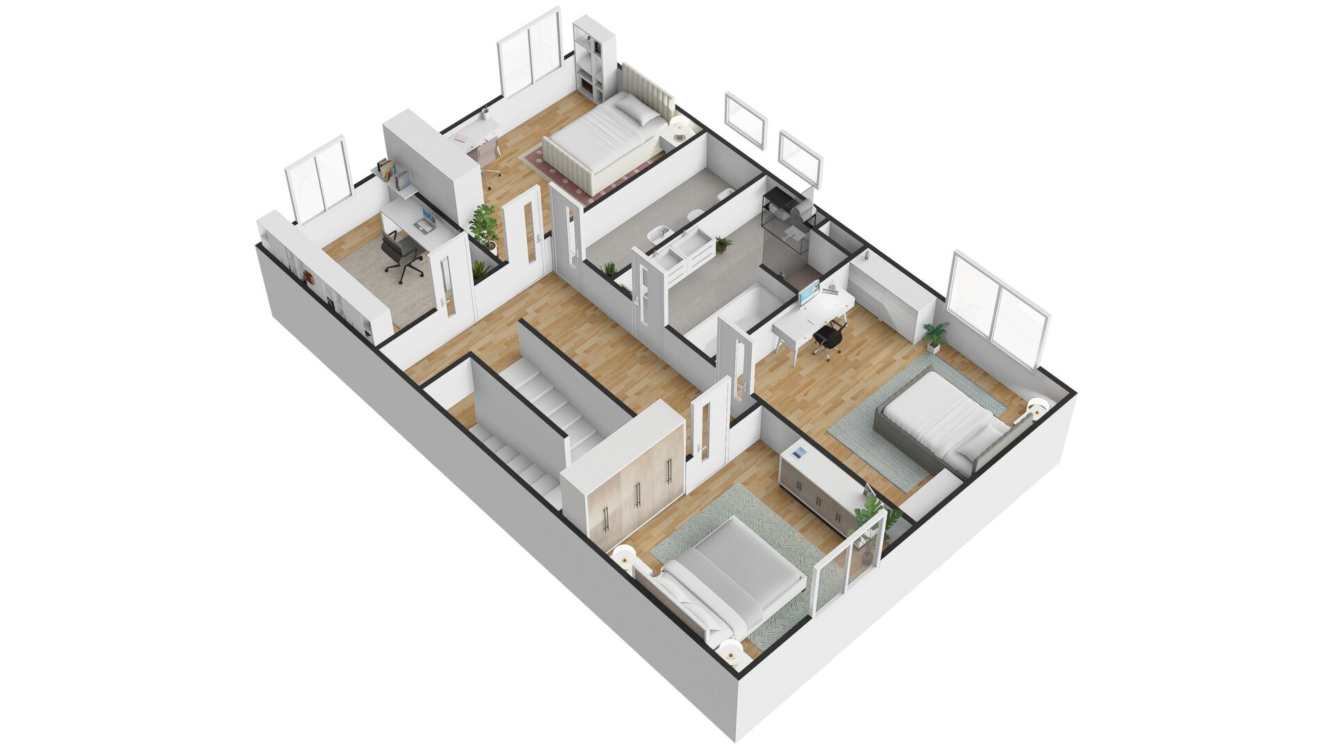 Horní patro poskytuje dostatek soukromého prostoru pro jednotlivé členy rodiny. V každém patře je koupelna a toaleta.