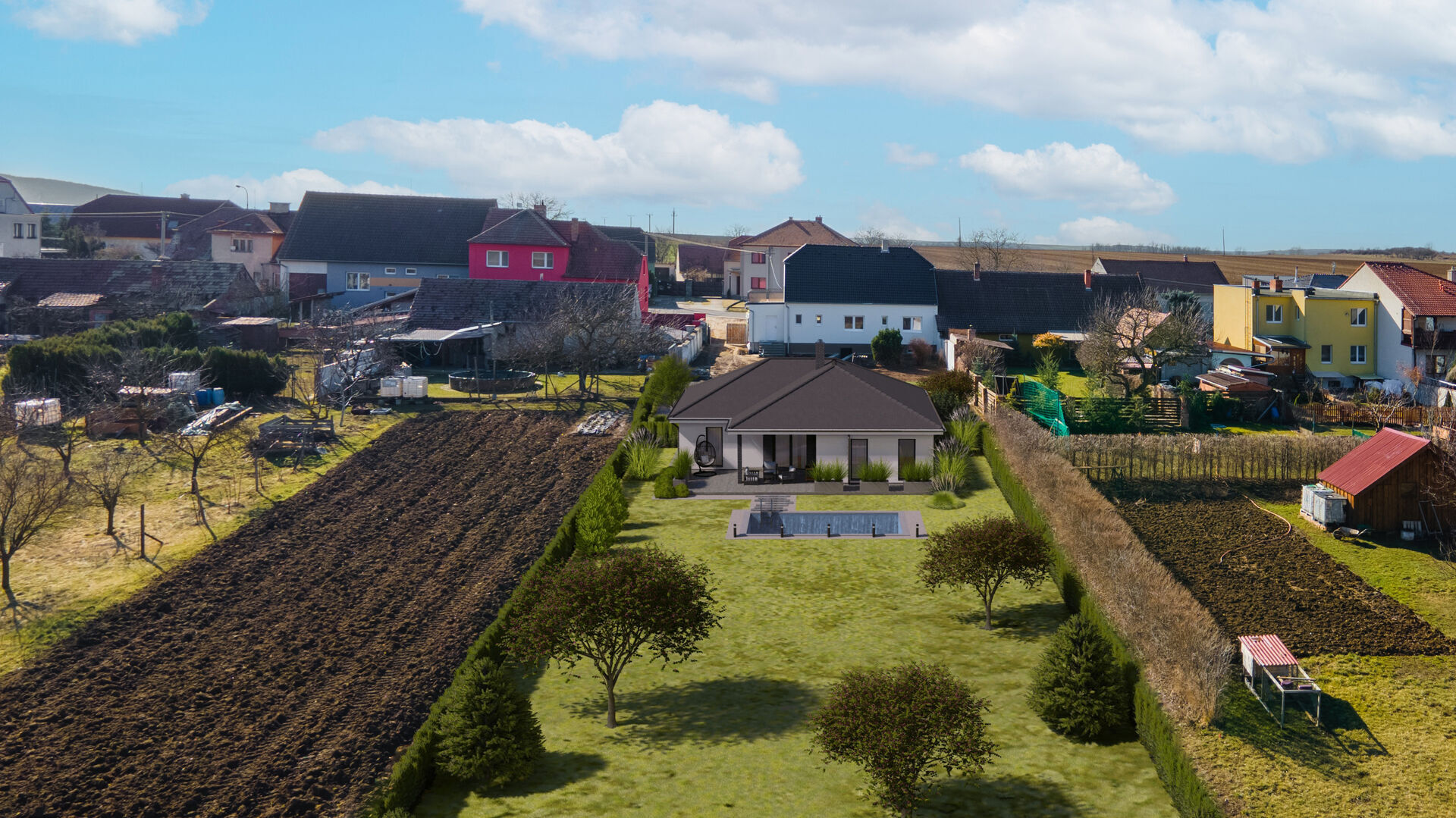 Součástí této nabídky je také projekt na stavbu dvoupatrového dvojdomu, každý 5+1 s užitnou podlahovou plochou 129 m², ideální zahradou, venkovním parkovacím stáním i garáží. K pozemkům náleží i společná příjezdová cesta.