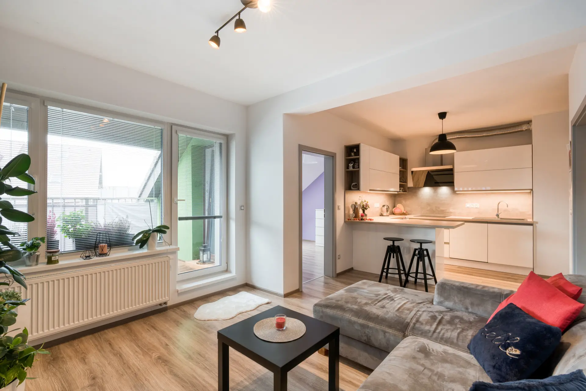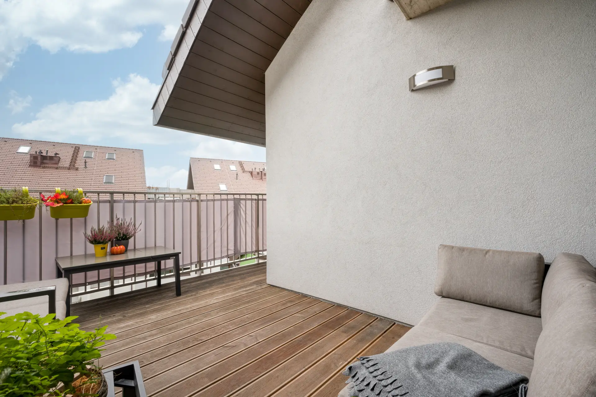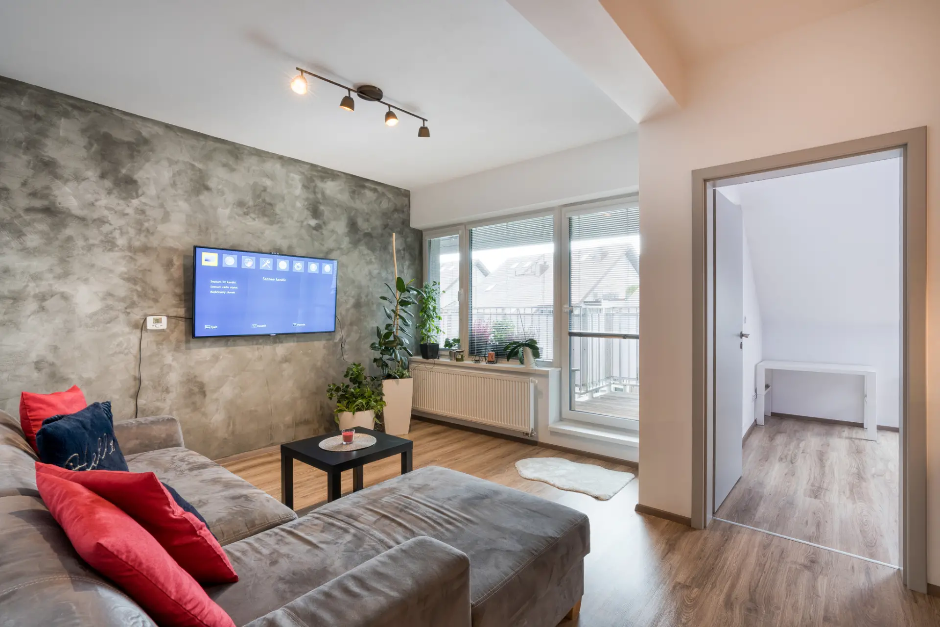 obývací pokoj s kuchyňským koutem 22,75 m², prostorná terasa 17 m² přístupná ze všech pokojů, ložnice