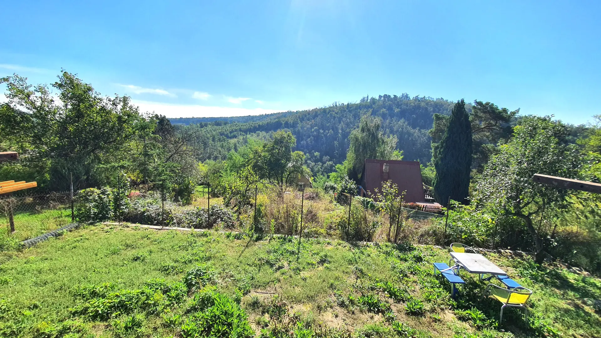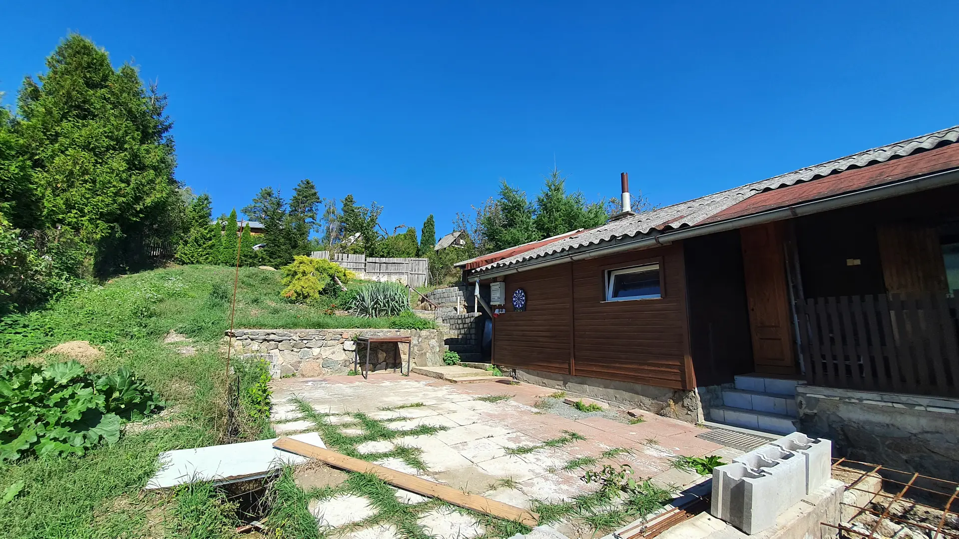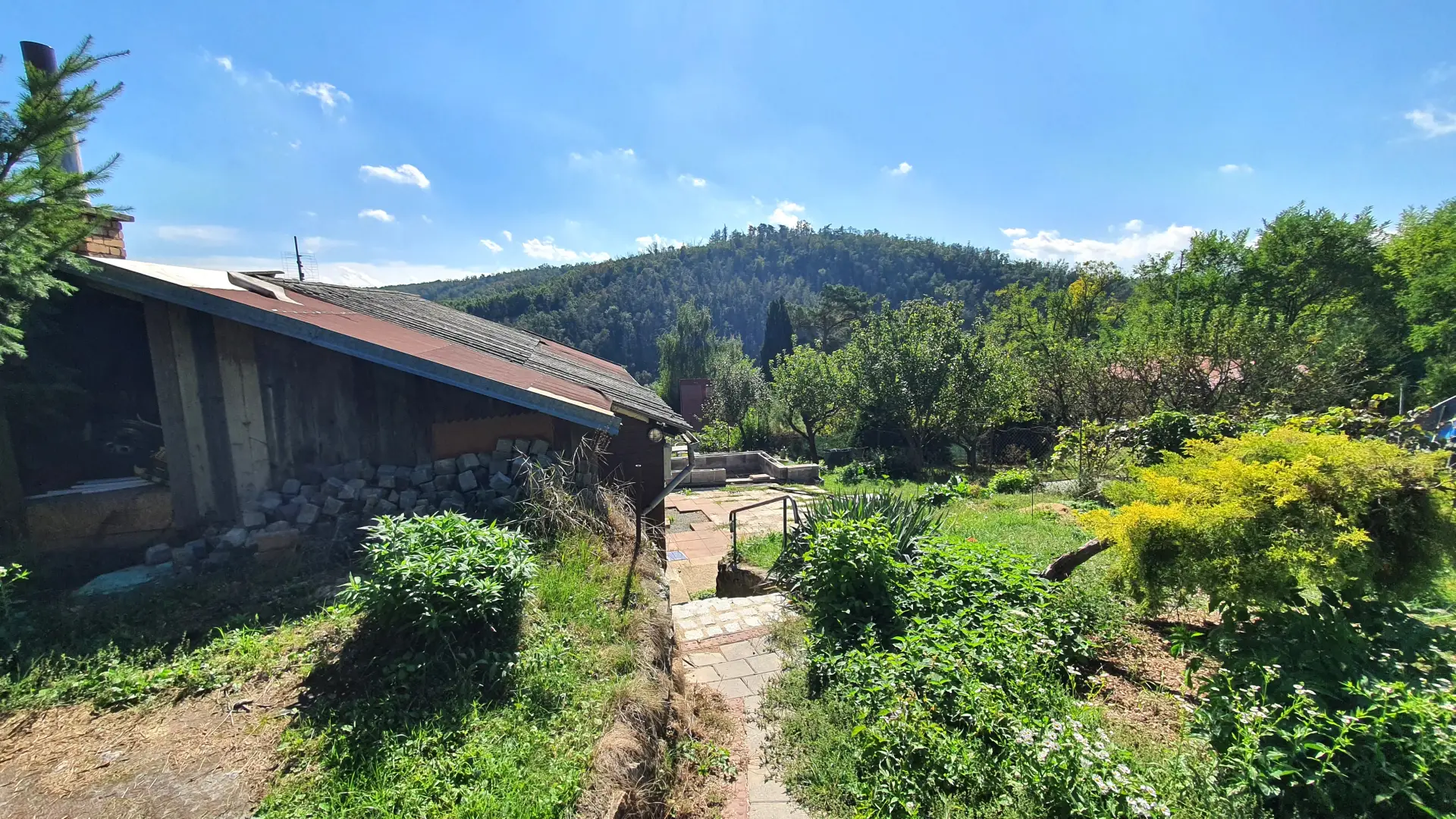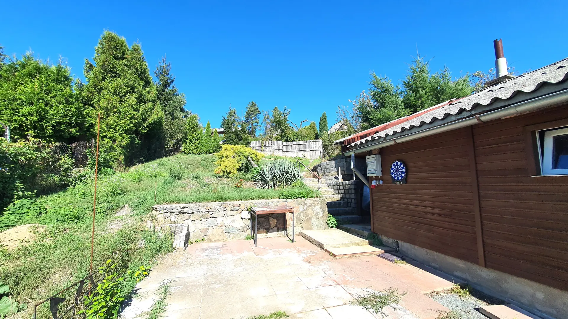 Zahrada je mírně svažitá, se srovnanými plochami.